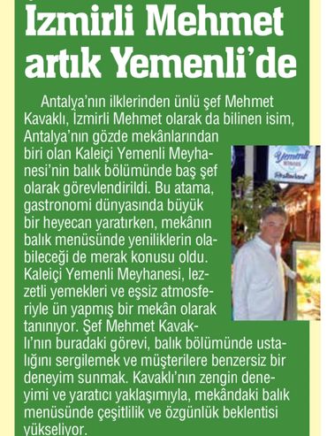Antalya'nın tarihi Kaleiçi´nin en sevilen meyhanesi olan Yemenli Meyhanesi, 200 kişilik toplam kapasitesiyle 12 ay boyunca hizmet vermektedir.